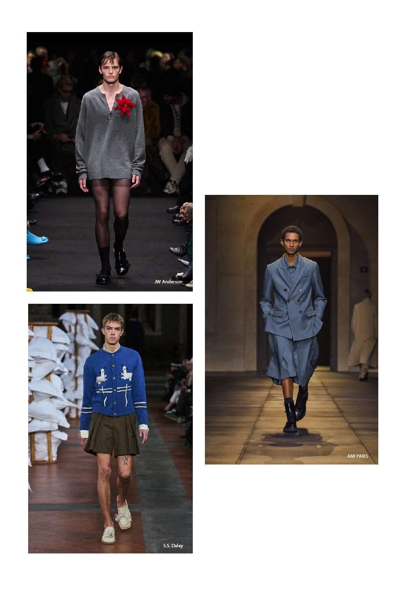 Designers like JW Anderson and S.S. Daley shook up the runways this season with the inclusion of pieces like skirts, dresses, and sheer stockings, creating dynamic looks by utilizing juxtapositions of texture, colour, and forms in their respective styles.