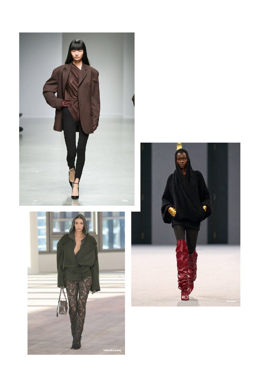 Designers across the runways are reimagining the sporty staple, with Balmain leading the charge — updating elegant stretch leggings tailored to perfection, designed to be layered beneath oversized knits and paired with over-the-knee boots. Atlein, meanwhile, elevates the silhouette from casualwear to considered chic, reviving the stirrup legging and spotlighting the timeless black version with structured, business-casual appeal.
